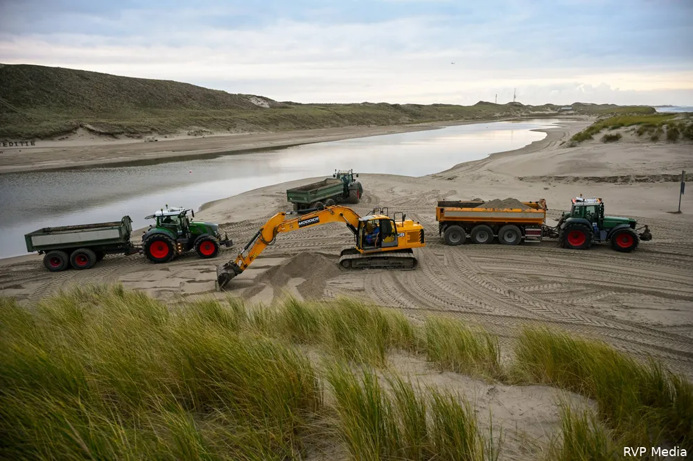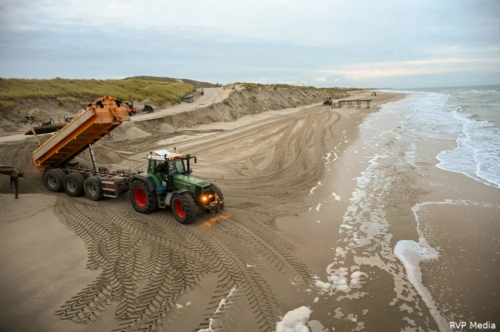 Het zand wordt momenteel aangevoerd en opnieuw opgebracht rond het paviljoen. Door de zware erosie waren zowel de trap vanaf het strand als de loopplank naar het terras onbegaanbaar geworden. Ook de grondplaten van het wandelpad raakten verzakt.