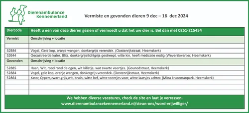 gevonden en vermiste dieren in en rond Beverwijk, Heemskerk, Castricum en