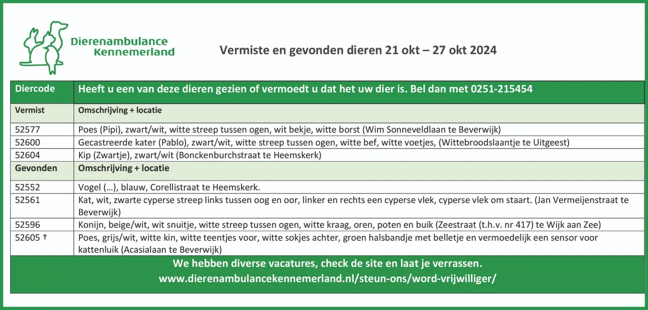 Iedere week publiceert Nieuws.nl de gevonden en vermiste dieren in en rond Beverwijk, Heemskerk, Castricum en Uitgeest op basis van de gegevens van Stichting Dierenambulance Kennemerland en Stichting Amivedi.