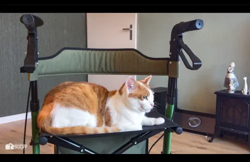 Nu en dan heeft hij een speels uurtje en rent dan door de kamers. Hij is inmiddels ook fan van mijn rollator, die ik ook in huis vanwege een (ik hoop tijdelijke) heupblessure gebruik. Als ik me binnen de woning daarmee verplaats blijft hij relaxt zitten en geniet van de rit. (zie ook filmpje)