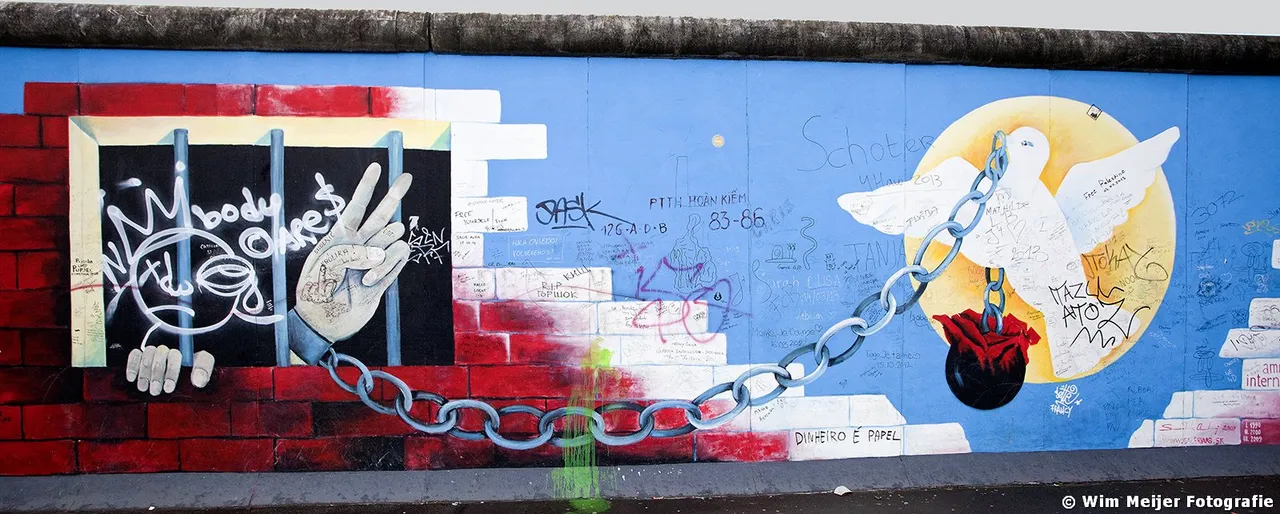 Hieronder een fotoserie van een deel van de Berlijnse Muur: de East Side Gallery , een stuk van de Berlijnse Muur met een lengte van 1.316 meter, in 1990 beschilderd door 118 kunstenaars uit 21 landen. De kunstenaars gaven in de schilderwerken hun visie op de politieke situatie in het Berlijn van 1989/1990. Inmiddels is de Side Gallery de grootste permanente openluchttentoonstelling ter wereld en is een verzoek ingediend om het op te nemen op de werelderfgoedlijst van UNESCO.
