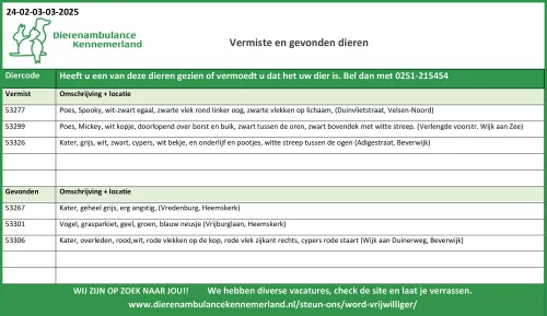 en vermiste dieren in en rond Beverwijk, Heemskerk, Castricum en Uitgeest op